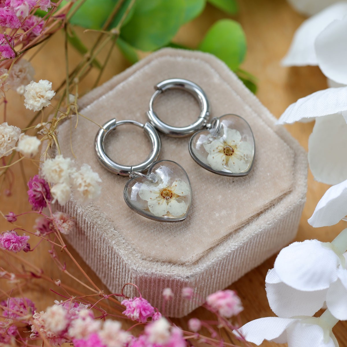 Each pair of earrings is a unique composition of real dried flowers, delicately embedded in transparent epoxy resin. It’s a subtle fusion of nature and modern design, turning the earrings into more than just an accessory – they become a reflection of your style and sensitivity.