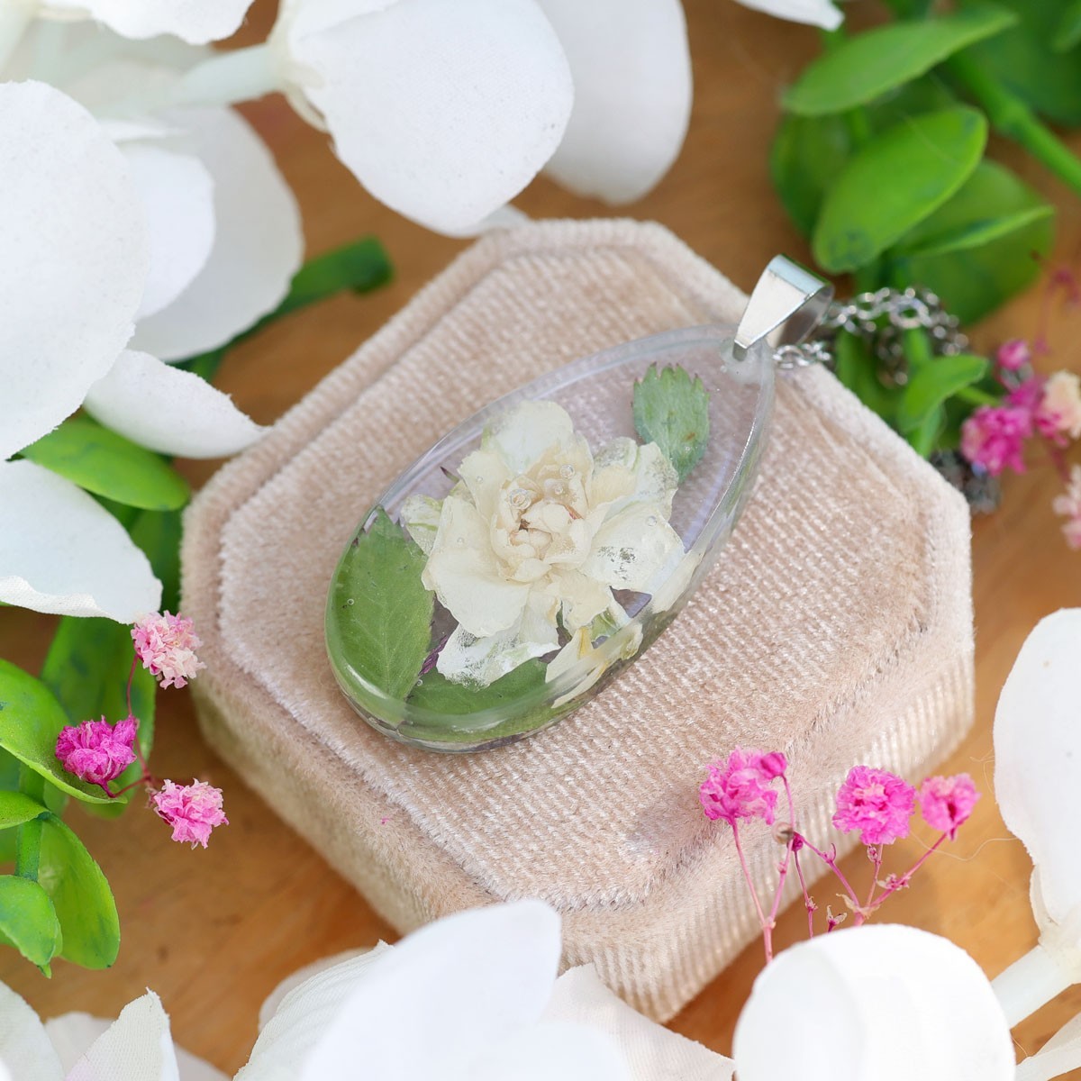 A handcrafted necklace featuring real dried flowers embedded in epoxy resin. The chain is made of surgical stainless steel, which does not tarnish, is hypoallergenic, and safe for sensitive skin. Each piece is one-of-a-kind and may slightly vary in flower placement or color tone.