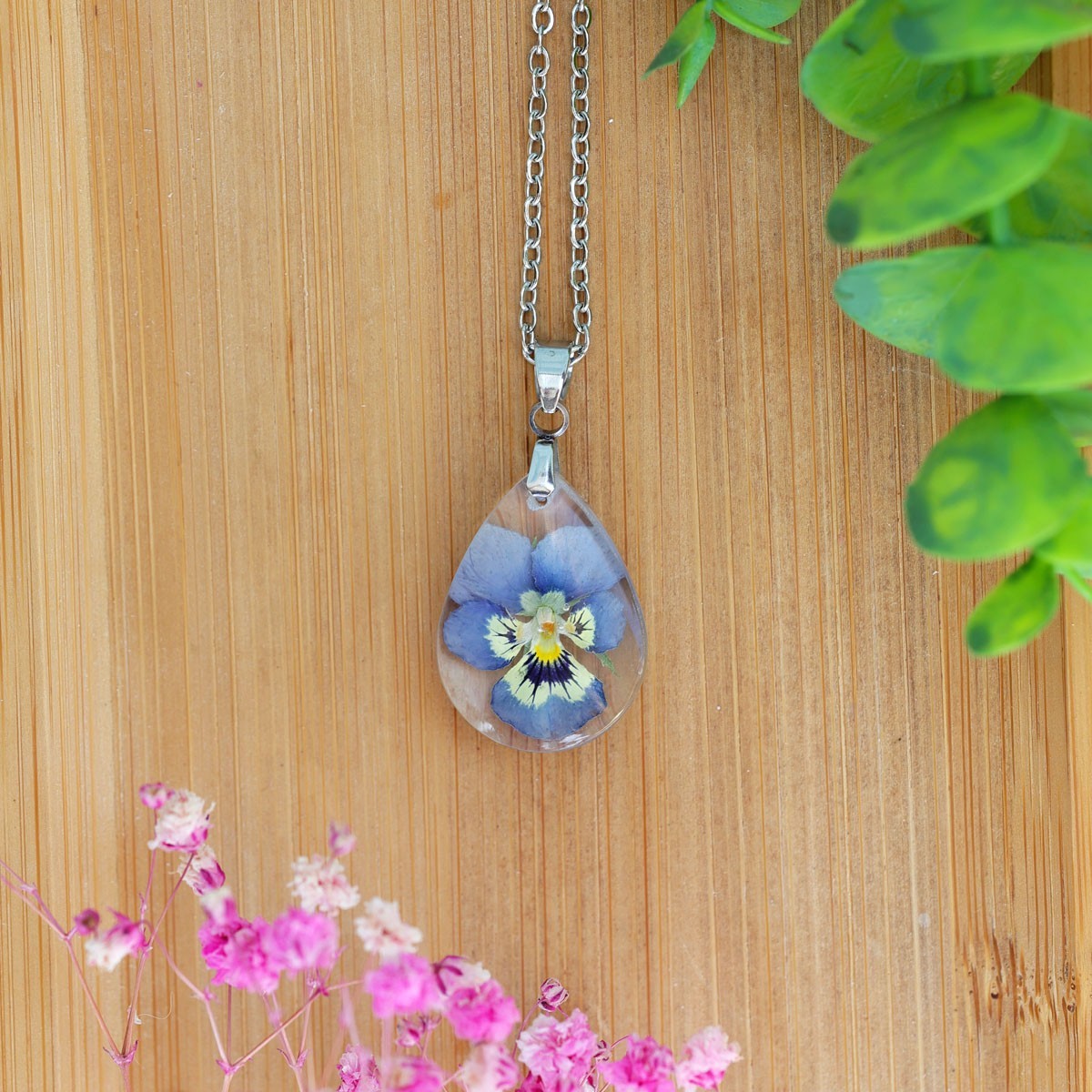 A handcrafted necklace featuring real dried flowers embedded in epoxy resin. The chain is made of surgical stainless steel, which does not tarnish, is hypoallergenic, and safe for sensitive skin. Each piece is one-of-a-kind and may slightly vary in flower placement or color tone.