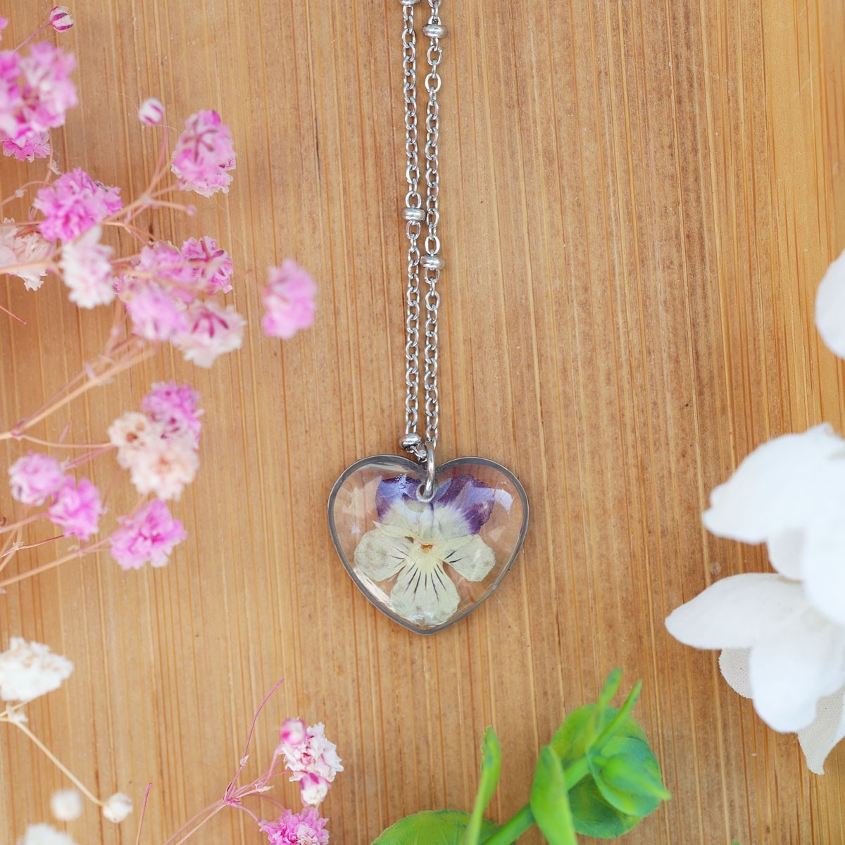 A handcrafted necklace featuring real dried flowers embedded in epoxy resin. The chain is made of surgical stainless steel, which does not tarnish, is hypoallergenic, and safe for sensitive skin. Each piece is one-of-a-kind and may slightly vary in flower placement or color tone.