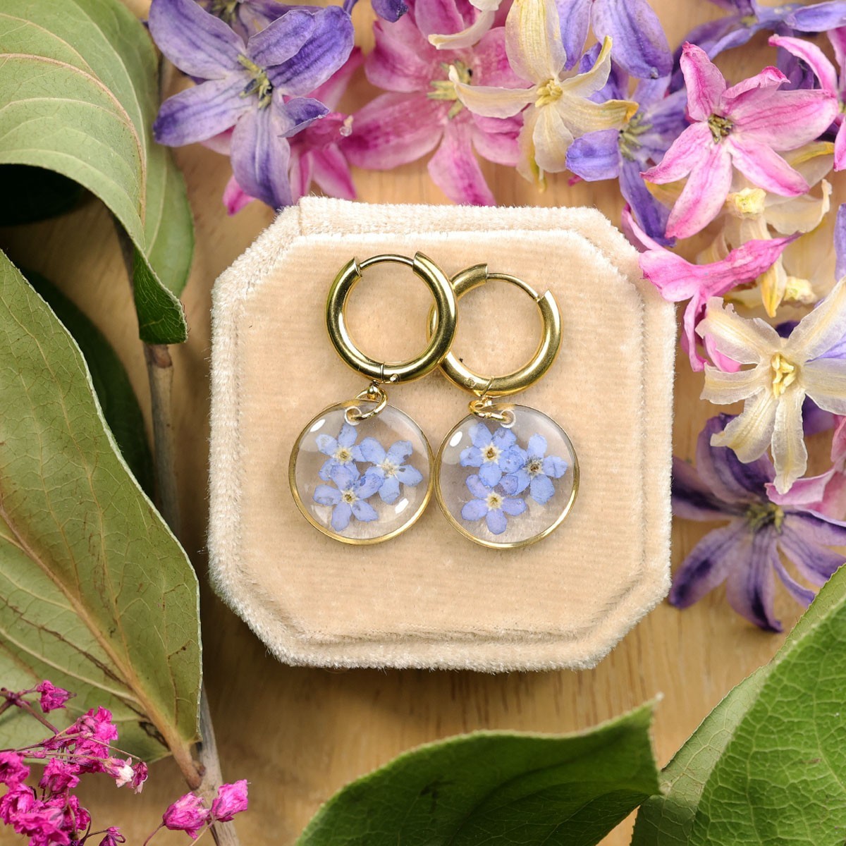 Each pair of earrings is a unique composition of real dried flowers, delicately embedded in transparent epoxy resin. It’s a subtle fusion of nature and modern design, turning the earrings into more than just an accessory – they become a reflection of your style and sensitivity.