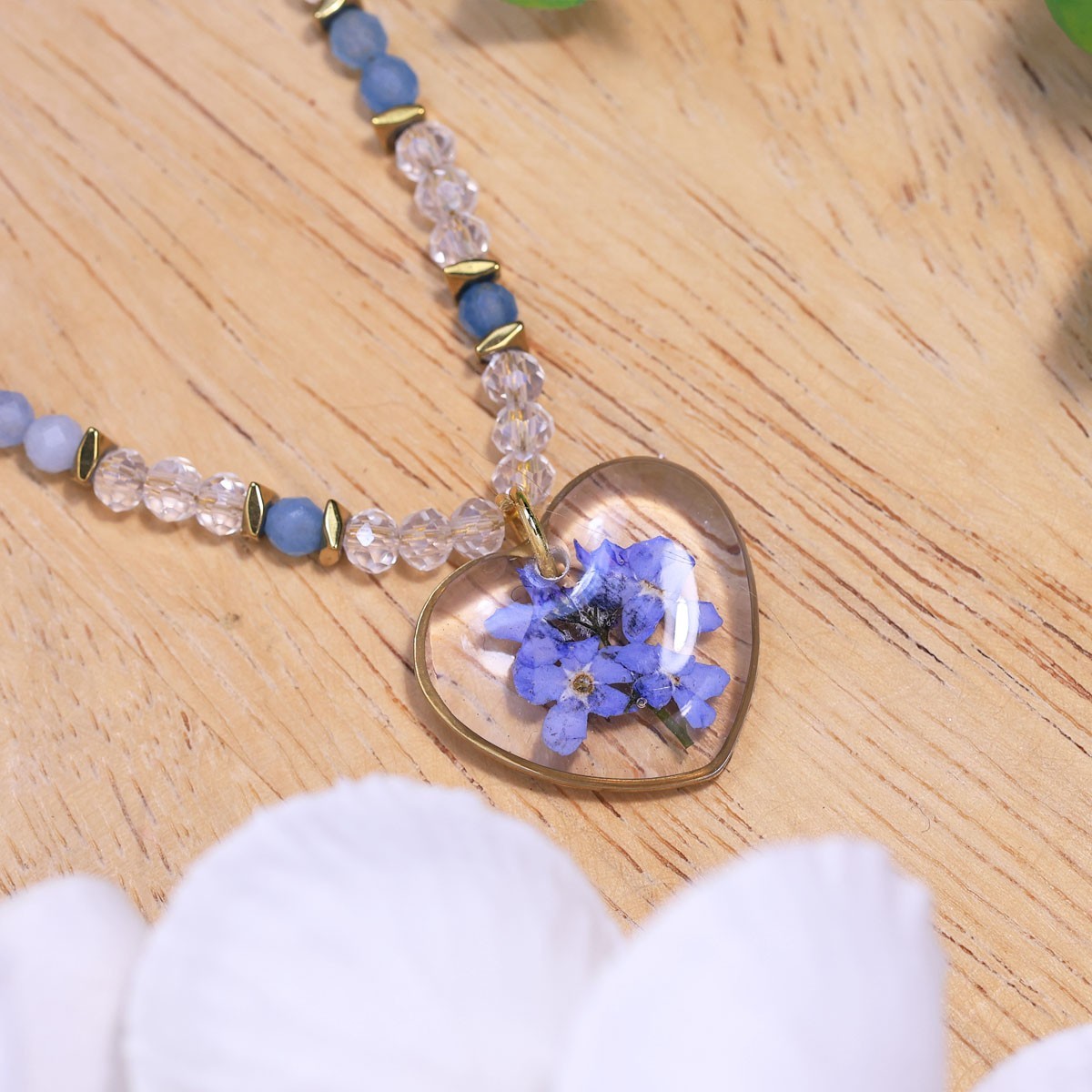 Ten naszyjnik to minimalistyczna forma piękna, w której główną rolę gra natura – subtelnie zatopione, w krystalicznie czystej żywicy prawdziwe, suszone kwiaty. Każdy egzemplarz to ręcznie wykonana, unikatowa kompozycja – lekka, eteryczna i pełna uroku.