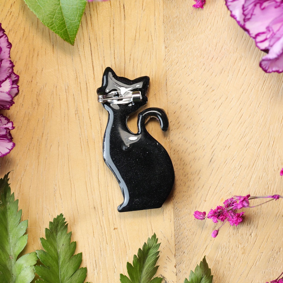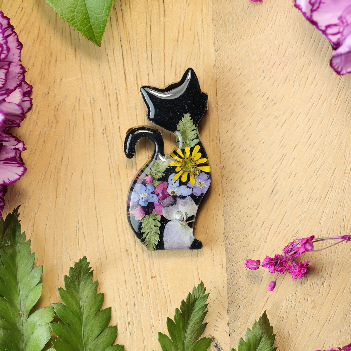 Ta wyjątkowa broszka to połączenie miłości do natury i kociej słodkości. Wykonana ręcznie z dbałością o każdy detal, przedstawia kontur kota. W jej wnętrzu zatopione zostały prawdziwe, suszone kwiaty, które nadają każdemu egzemplarzowi niepowtarzalny charakter.